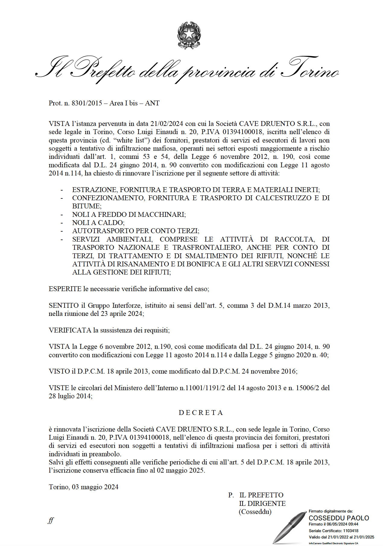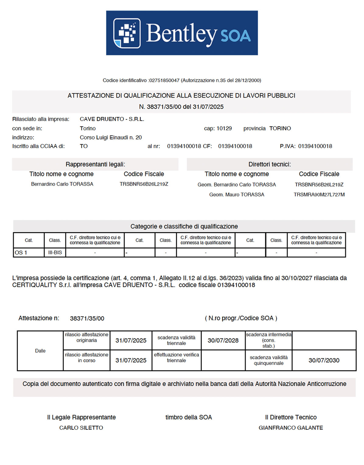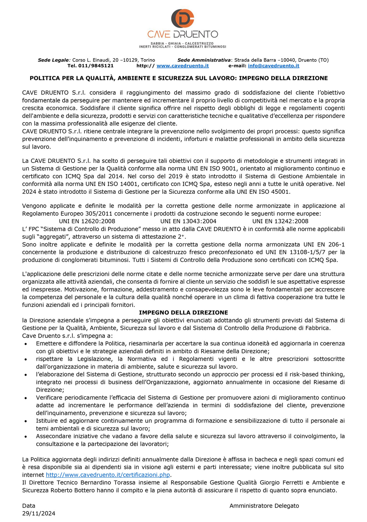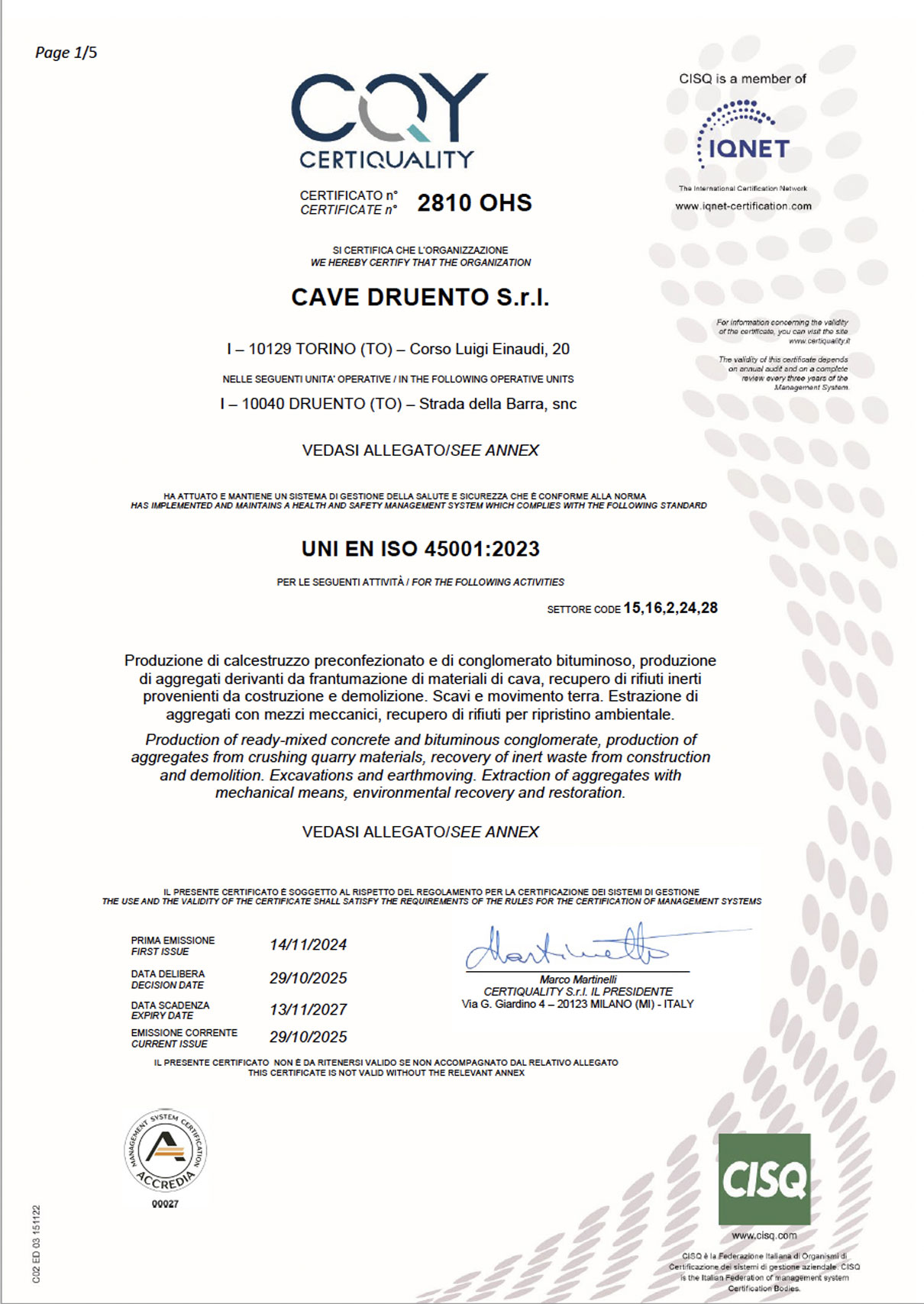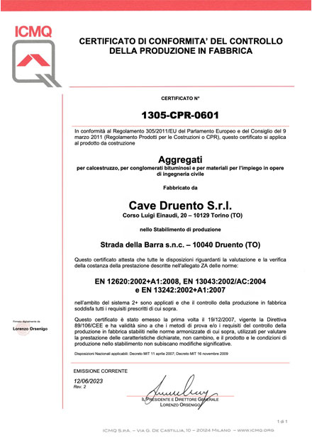 La società Cave Druento Srl svolge accurati controlli di qualità sui propri materiali e tutti vengono testati sia dal proprio laboratorio, che da laboratori esterni certificati M.I.U.R. che collaborano da anni con la nostra società.