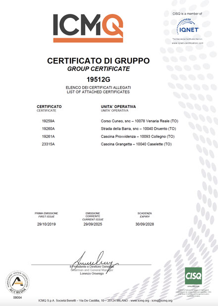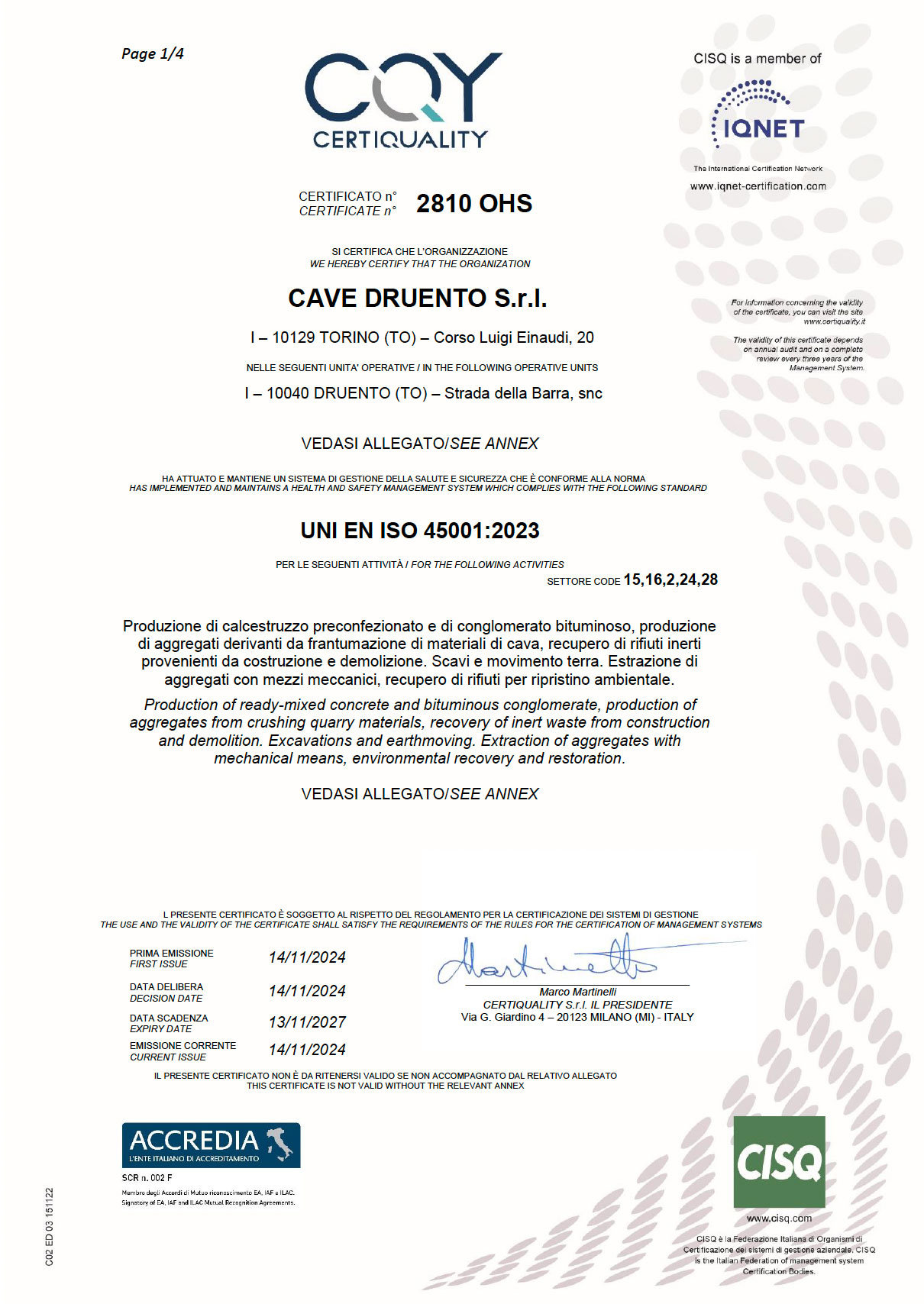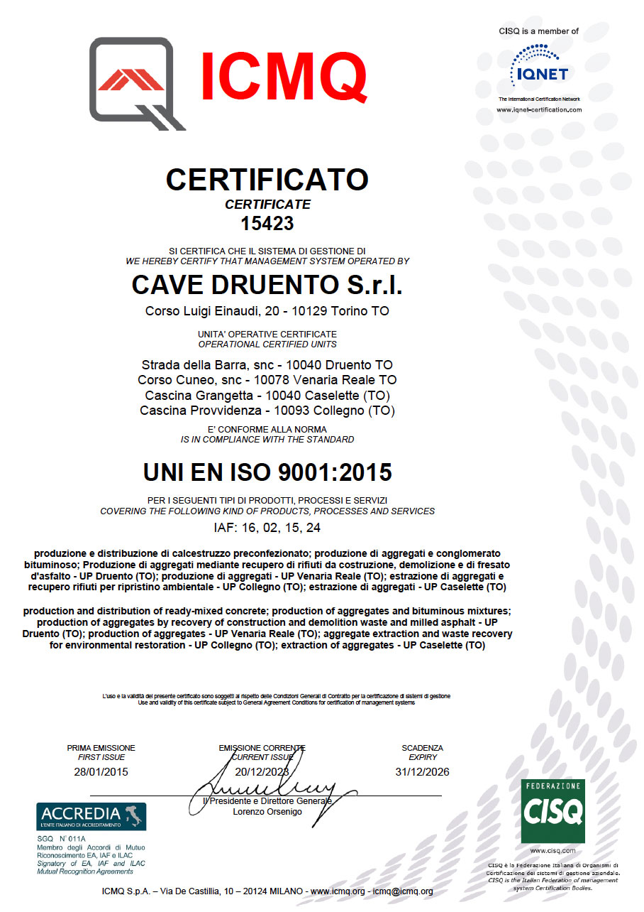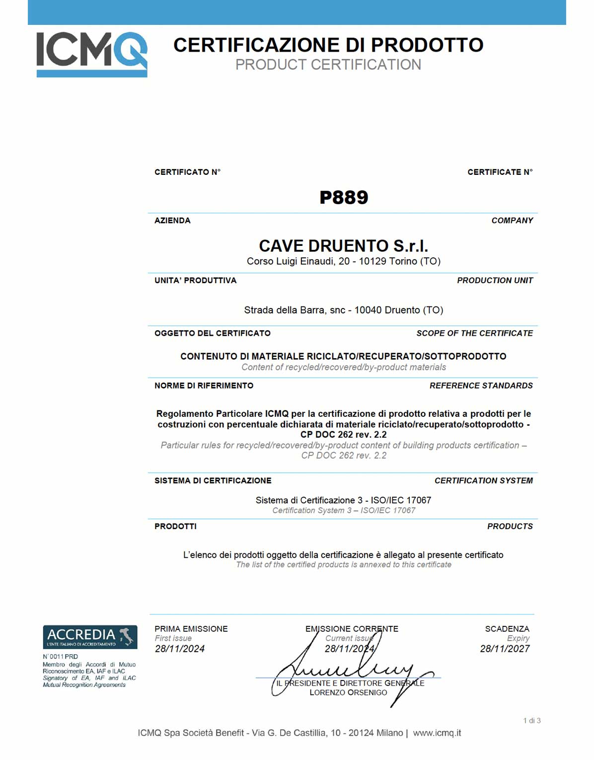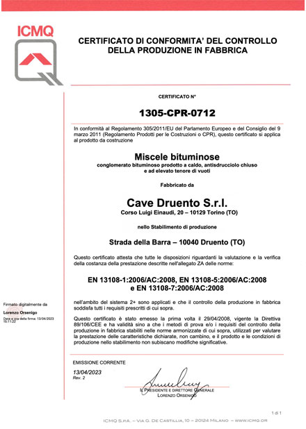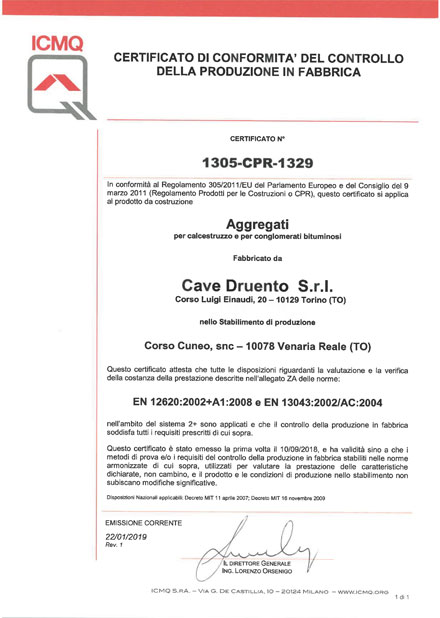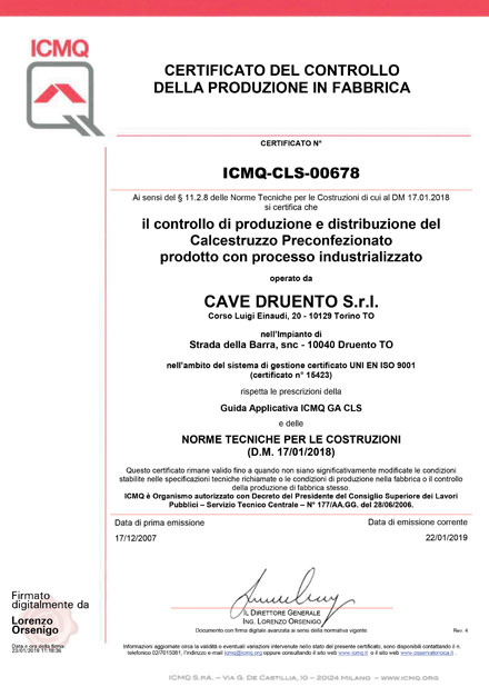 Il tutto viene monitorato tramite ICMQ Spa, ente certificato ACCREDIA e dal Ministero dei Lavori pubblici, che svolge l’ispezione iniziale della fabbrica e del controllo della produzione della stessa ed esegue la sorveglianza continua la valutazione e l’approvazione del controllo della produzione di fabbrica.